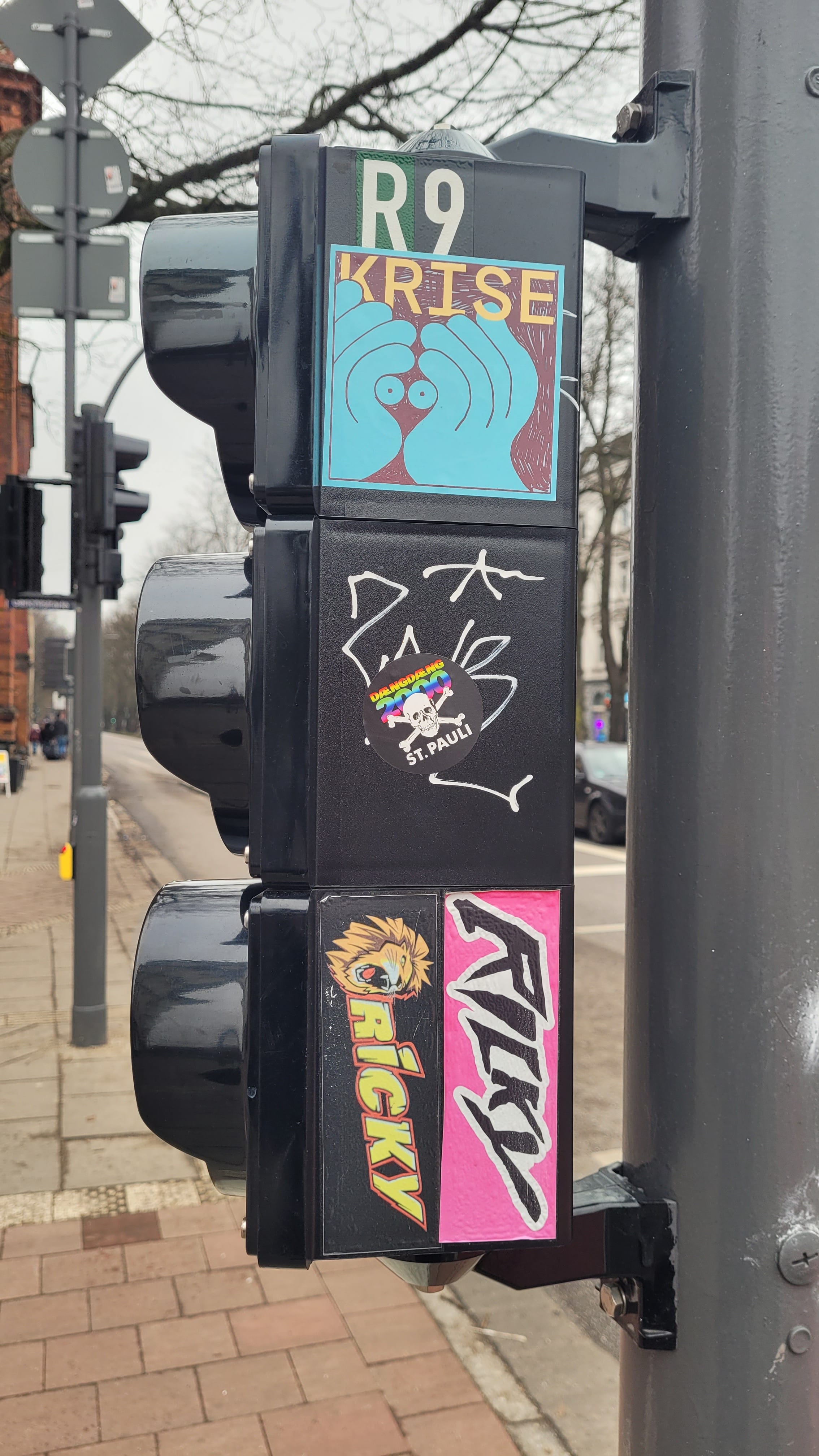 Als ich ein wenig später die Max-Brauer-Allee hinunter schlendere, bleibt mein Blick an einer Fahrradampel hängen. Von oben nach unten erzählen die Sticker eine kurze Geschichte, eine des Spiels gg Dortmund vielleicht: